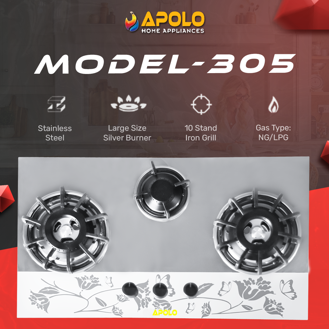 Model 305 - 3 Burner - Manual Hob / Stove - 100% Pure Stainless Steel Top