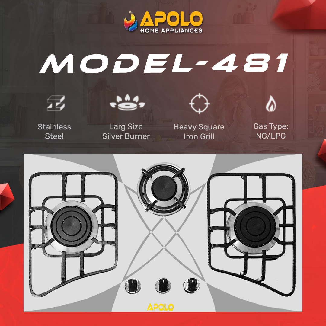 Model 481 - 3 Burner - Manual Hob / Stove - 100% Pure Stainless Steel Top